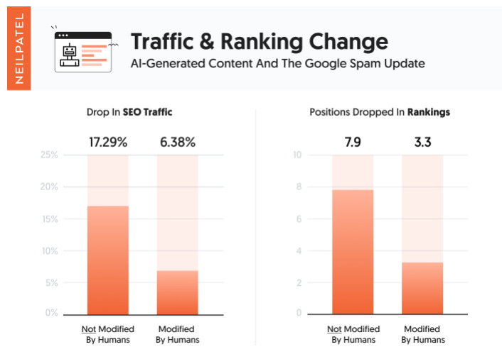 Neil Patel recently experimented with two large groups of websites. The first group had 100% AI generated content and the second group had content that was initially generated by AI but was modified by humans.